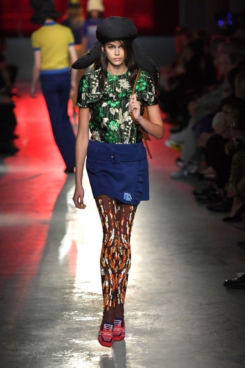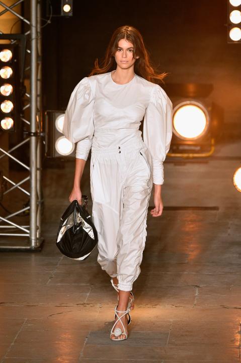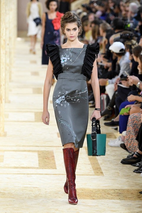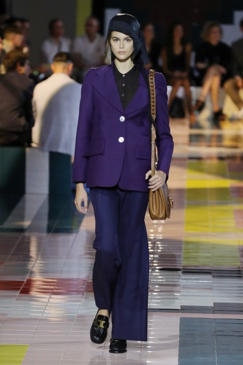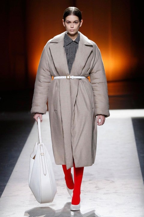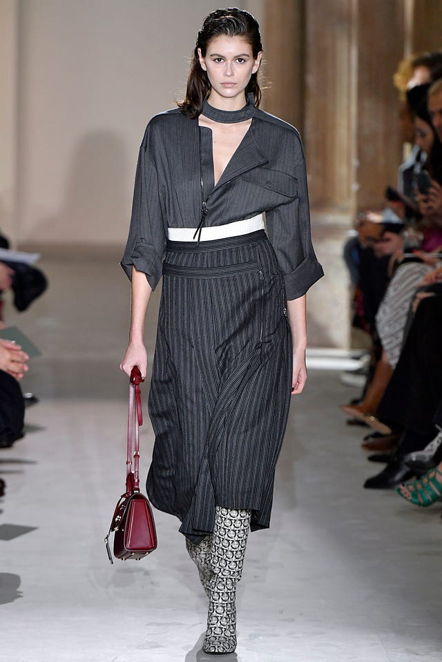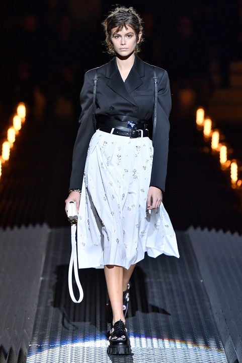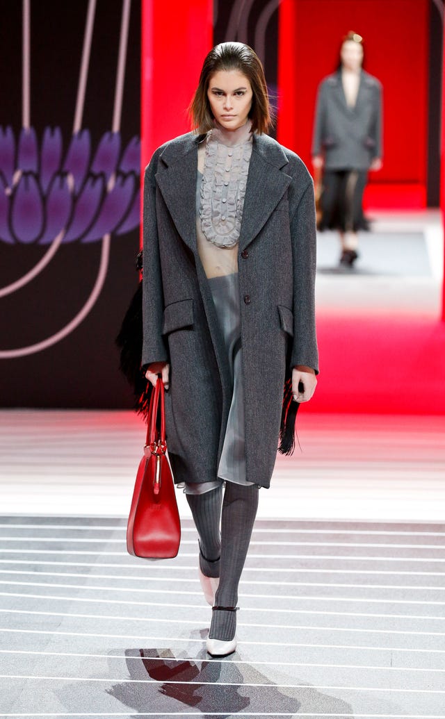 Shades of gray looked fabulous on Gerber during the Prada Ready-to-Wear Fall/Winter 2020-2021 fashion show in Milan on Feb. 20, especially when paired with a bright red tote and white ankle-strap heels.