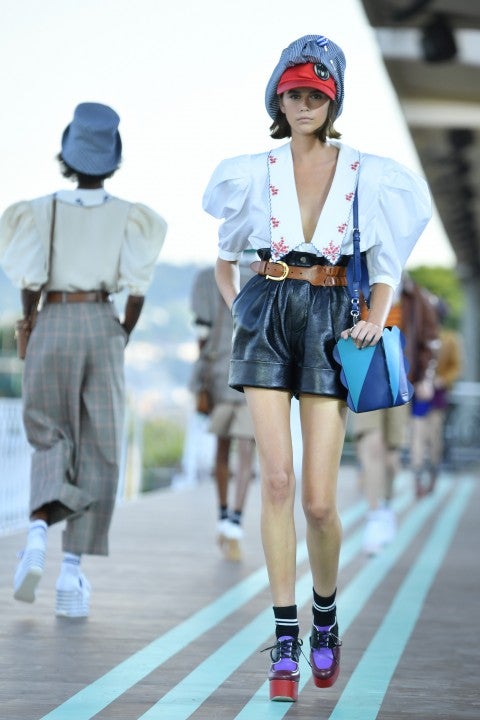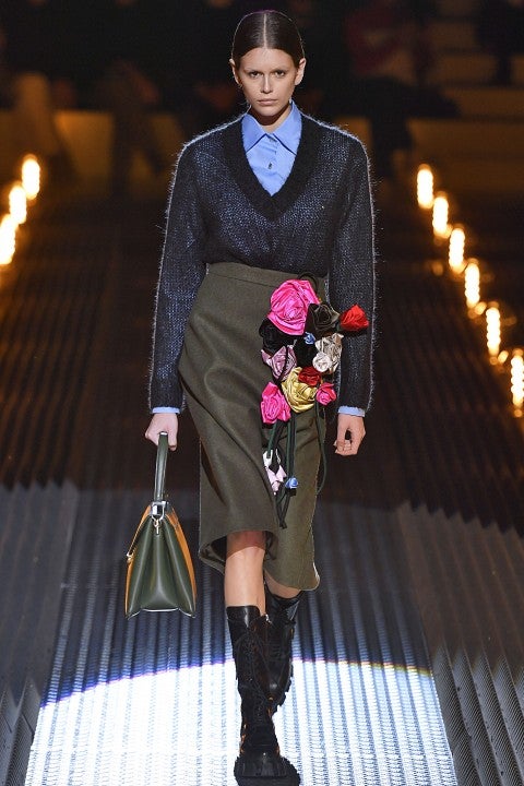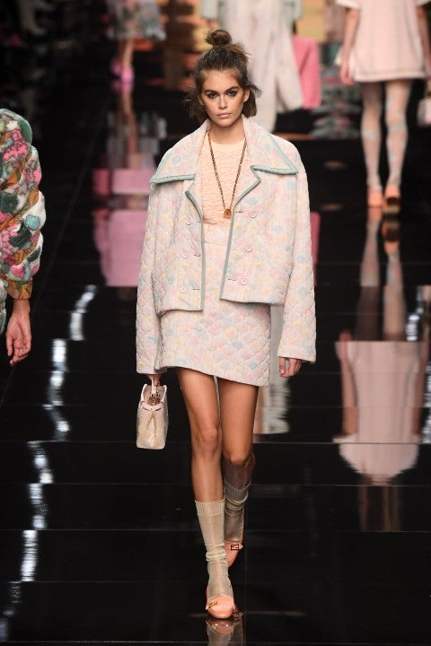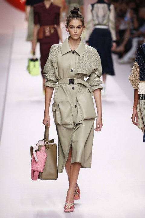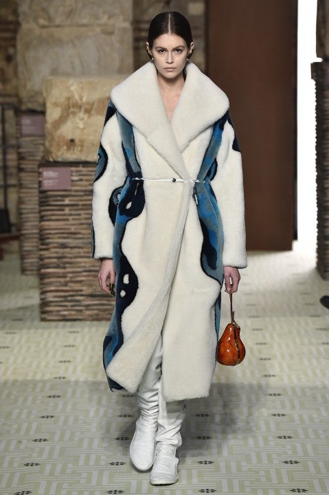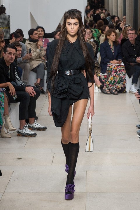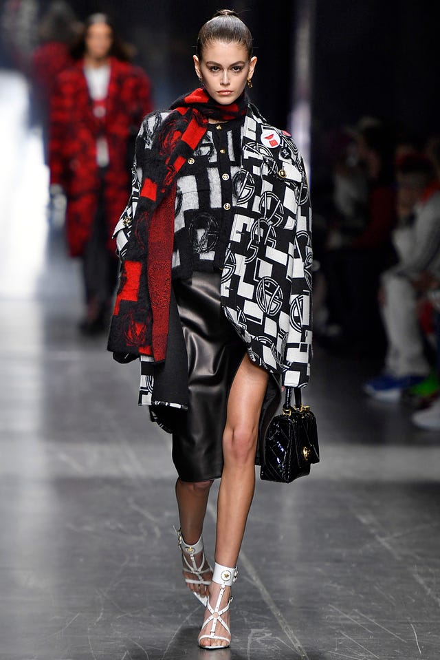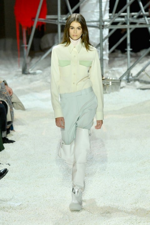 Shades of gray looked fabulous on Gerber during the Prada Ready-to-Wear Fall/Winter 2020-2021 fashion show in Milan on Feb. 20, especially when paired with a bright red tote and white ankle-strap heels.