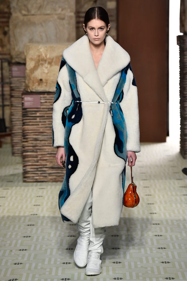 A thin white belt helped cinch in Gerber's waist as she walked the Tod's runway in an oversized trench that topped a plaid jacket and red tights and carried an oversized white trench during Milan Fashion Week on Feb. 21.