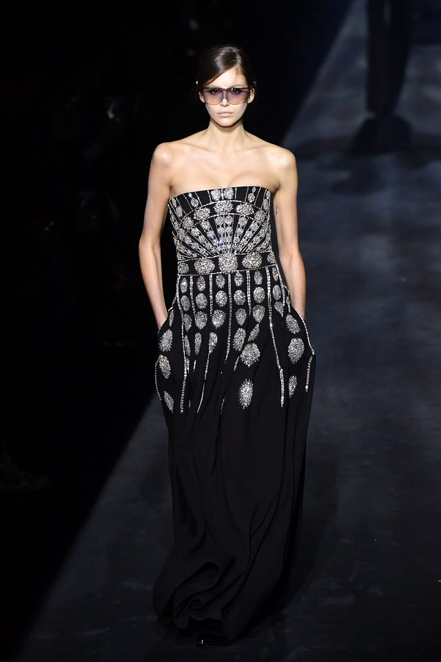 The burgeoning model strutted her stuff in an interestingly sculptured -- but sequined! -- mini on the Saint Laurent runway during Paris Fashion Week on Sept. 26.