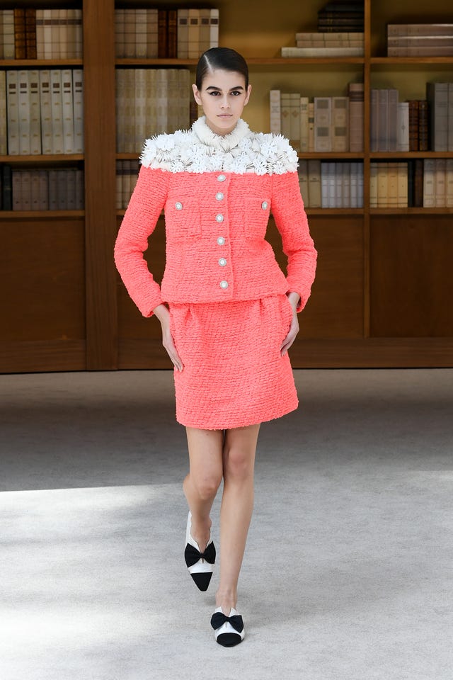 At just 16 years old, the daughter of supermodel Cindy Crawford and Rande Gerber made her couture debut at the Grand Palais in Paris, France, on Jan. 23, walking the runway for Chanel's garden party-themed show. The fashionista, a fresh muse for the label, looked like a fairytale dream as she made her way down the runway in head-to-toe powder pink. Rocking dramatic brows, peach cheeks and a pretty pink lip color, Gerber was a true sight to see when she strutted her stuff in a dress with a structured silhouette, which featured a bell skirt and feathered sleeves.