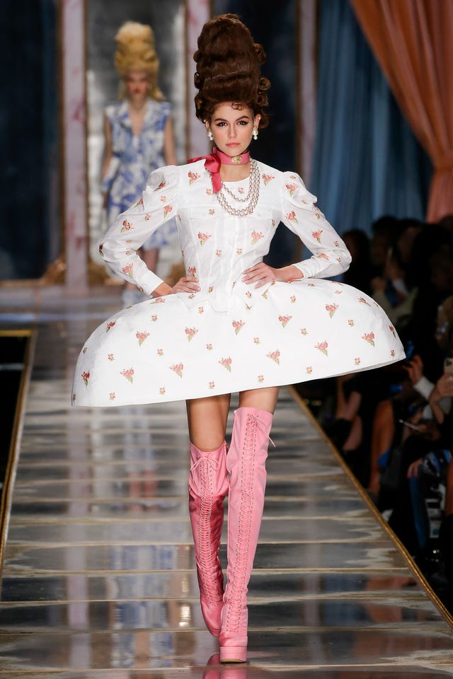 The California girl sashayed down the Moschino Ready-to-Wear runway in a quirky, Marie Antoinette-inspired rose dress and thigh-high, pink lace-up platforms during Milan Fashion Week on Feb. 20.