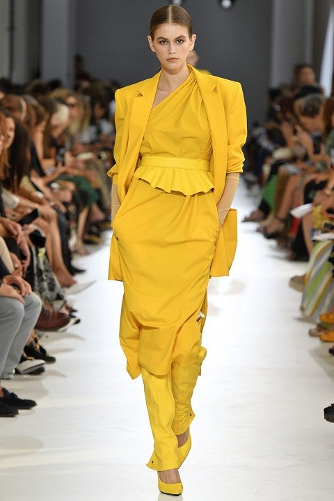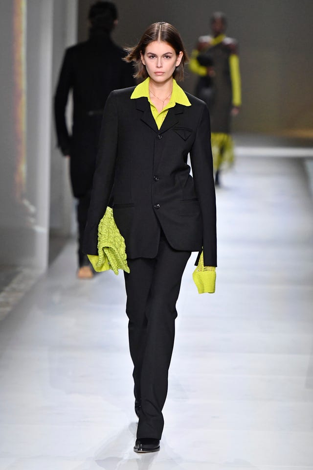 A neon yellow-green, ruffled dress shirt added a pop of flair to a black suit when the brunette beauty walked the runway during the Bottega Veneta fashion show in Milan, Italy, on Feb. 22.