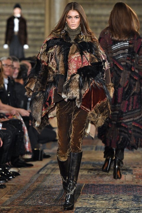 Gerber looked straight out of a chic western in a black-and-tan suede mini with a leather coat and matching boots at the American brand's show on Feb. 13.