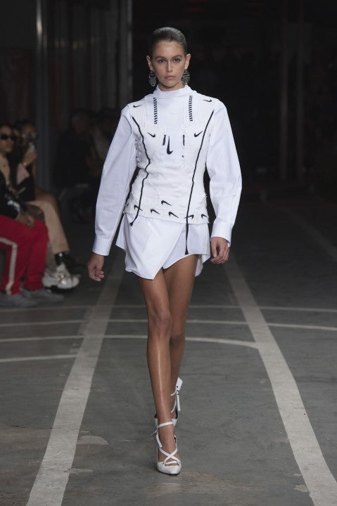 Gerber stunned in a white-hot tank mini and clear sandals during Alexander Wang's NYFW show on Sept. 9.