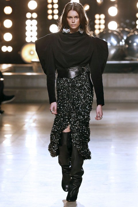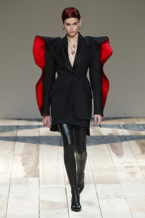 Red highlights accented the exaggerated butterfly-esque sleeves on Gerber's plunging black-and-crimson jacket, which was paired with a matching skirt and thigh-high boots for Alexander McQueen's March 1 show in Paris.