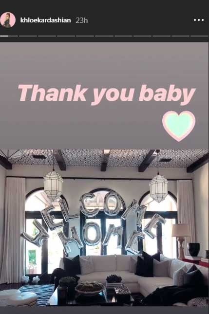 When Khloe returned from a family trip to Bali on Oct. 27, she got a sweet surprise from Tristan. Upon opening the door to her house in Calabasas, California, she found a heartwarming message written in silver letter-shaped balloons that read "Welcome Home." "Thank you baby," True's mama wrote above the pic, along with a pink heart emoji.