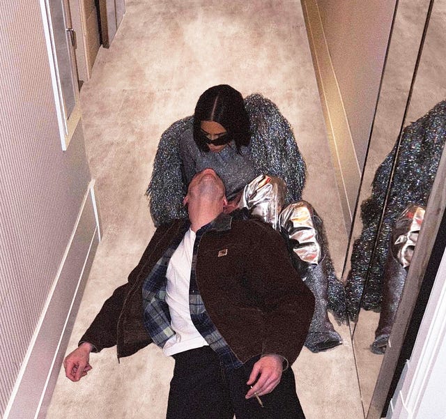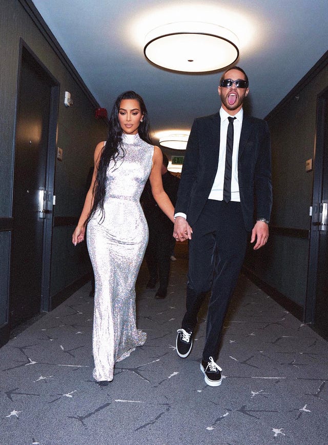 Kim Kardashian shares some behind-the-scenes snaps of Pete Davidson during the Los Angeles premiere of Hulu's new The Kardashians show on April 26, 2022.
