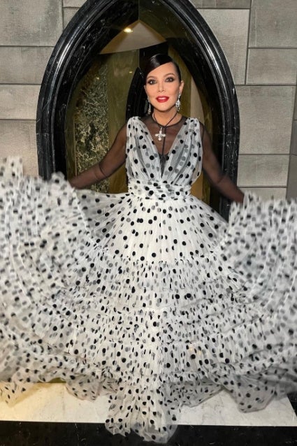 Kris Jenner posts to Instagram wearing a white dress with black polka dots on May 22, 2022 for Kourtney Kardashian and Travis Barker's wedding.