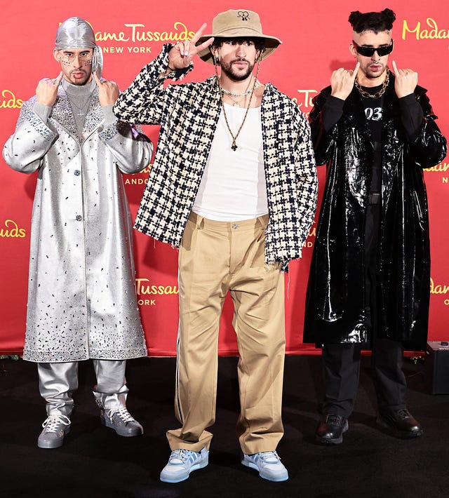 Rapper Bad Bunny posed with his revealed wax figures for Madame Tussauds New York and Madame Tussauds Orlando at Madame Tussauds on April 19 in New York City.