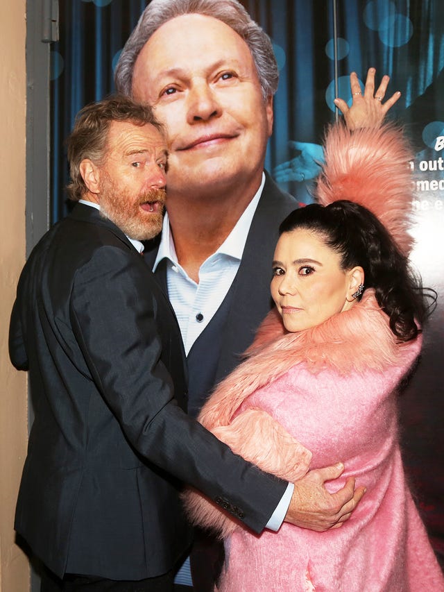 Actors Bryan Cranston and Alex Borstein having fun with Billy Crystal poster at the opening night of Mr. Saturday Night on April 27 in New York City.