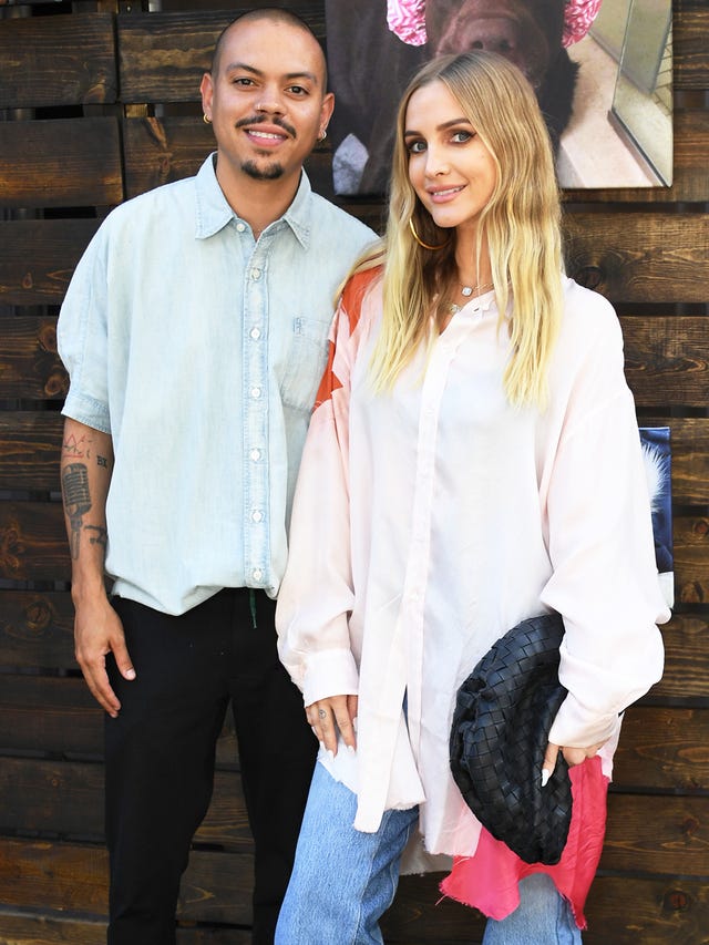 The couple Evan Ross and Ashlee Simpson pose at Kathy Hilton x Halo Dog Collar National Pet Month Garden Party on April 26 in Bel Air, California.