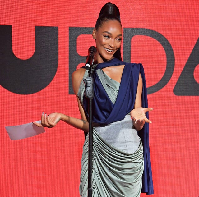 British model Jourdan Dunn speaks onstage during the 2022 International Woolmark prize final at 180 The Strand on April 26 in London, England.