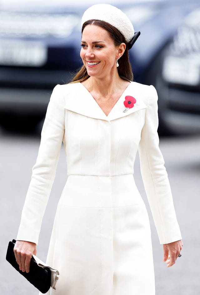 Kate Middleton joins husband Prince William at the Service of Commemoration and Thanksgiving at Westminster Abbey, commemorating Anzac Day on April 25 in London, England.