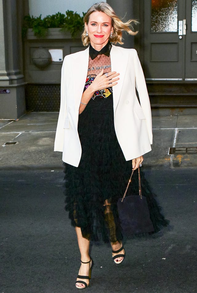 British actress Naomi Watts seen arriving at the 2022 Tribeca Ball on April 19. She is wearing a stylish white blazer and black dress in New York City streets.