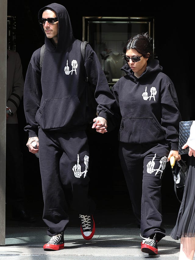 Lovebirds Travis Barker and Kourtney Kardashian step out in matching outfits in Milan, Italy on April 28.