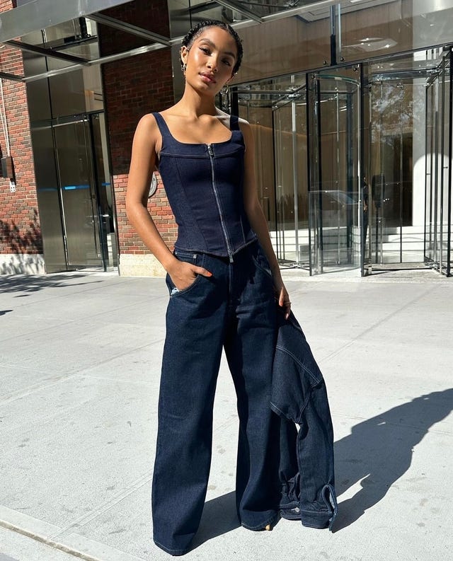 On April 24, the actress poses in the EB Denim Rainy Corset, Cropped Max Jacket, and Outpost Jean in midnight while out and about in New York City.