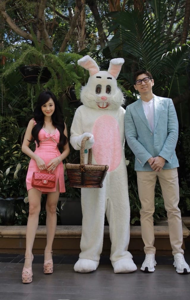 The former Bling Empire stars host an elegant Easter brunch prepared by executive chef Mitch Austin, featuring Sugarfina at Culina, at the Four Seasons Hotel in Beverly Hills, California. Guests enjoyed omelets, vanilla Belgium waffles, specialty pastries, deviled eggs, artisanal salads, cheeses, nigiri sushi, king crab claws, oysters, shrimp cocktail, smoked and cold poached salmon, roasted prime rib, carved spring lamb leg, maple glazed smoked ham, house-made doughnuts, cotton candy, carrot cake, gelato, and an Easter Bunny appearance and Easter egg hunt.