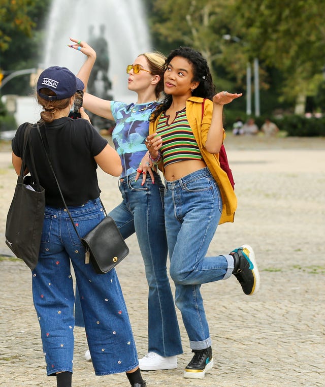 The co-stars goofed off a little while on the set of Not Okay on Aug. 17 in New York City