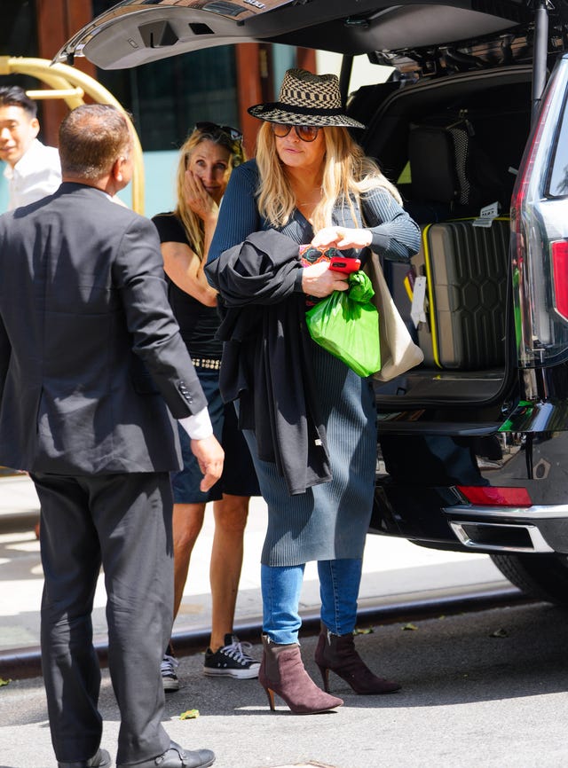 The White Lotus actress is seen on Aug. 5 in New York City with a cool checkered hat.