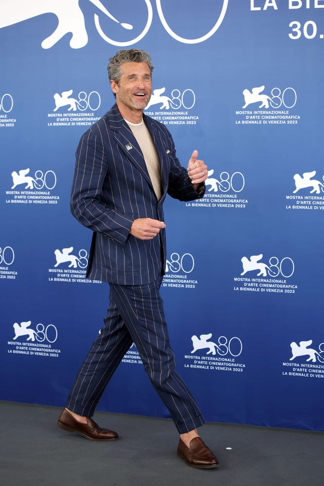 Dressed in a Brunello Cucinelli suit, the Grey's Anatomy alum attends a photocall for Ferrari at the 80th Venice International Film Festival on Aug. 31 in Venice, Italy.