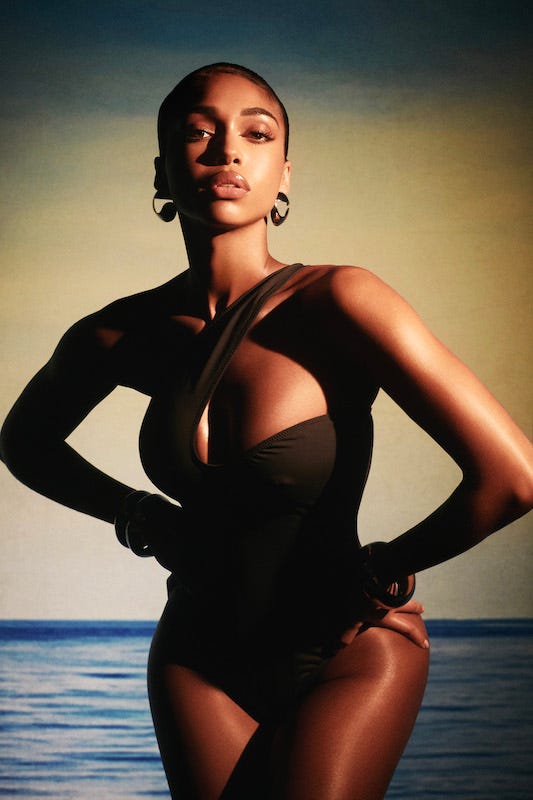 The model stuns in her new swimwear line, YEVRAH, filled with one-pieces, one-shoulder styles, wrap bikinis, t-shirt tops, bandeaus, playsuits, and skirts, available exclusively on REVOLVE.