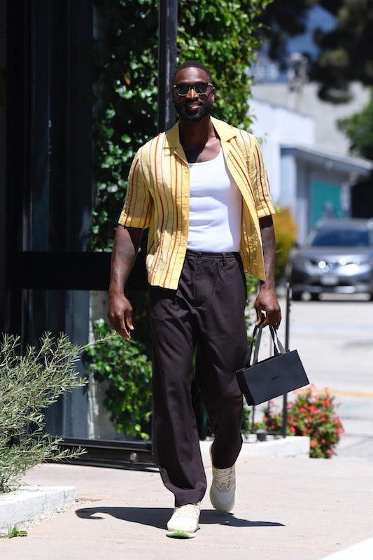 The former professional basketball player looks stylish in Versace sunglasses, a Jacquemus shirt and Marni Pants from FWRD while shopping at the FWRD Pop Up in Los Angeles, California, on Aug. 6.