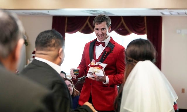 The athlete teams up with Old Spice and acts as a ring bearer for Omar and Lauren Mejia's wedding at the Little White Wedding Chapel in Las Vegas, Nevada, on Feb. 8.
