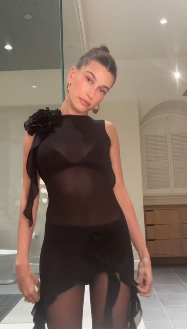 The model poses in a sheer dress and Calzedonia tights in a TikTok video before heading to dinner in Los Angeles, California on Jan. 4.