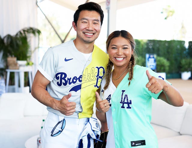 Actor Simu Liu and Olympic snowboarder Chloe Kim pose for a photo during the Batting Practice Hospitality & Media for MGM All-Star Celebrity softball game at Dodger Stadium on July 16 in Los Angeles, California.