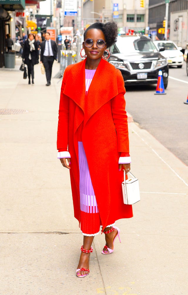 Now this is a street style star! The Us actress brightened up the streets of New York City in a bold red coat and lilac dress as she headed into the Late Show With Stephen Colbert set on March 18.