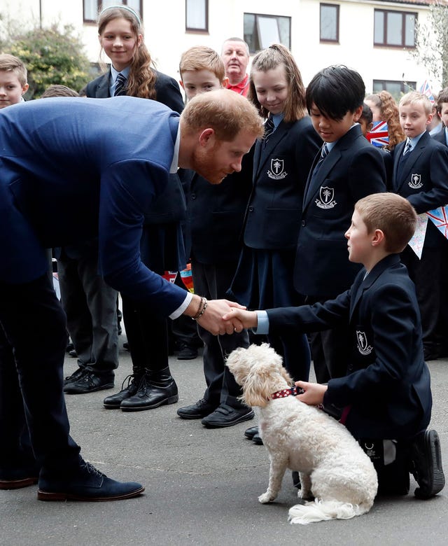 The Duke of Sussex met a St. Vincent's Catholic Primary School student and the head teachers' dog, Winnie, before helping plant trees from the Woodland Trust while visiting the kids in Acton, England, on March 20.