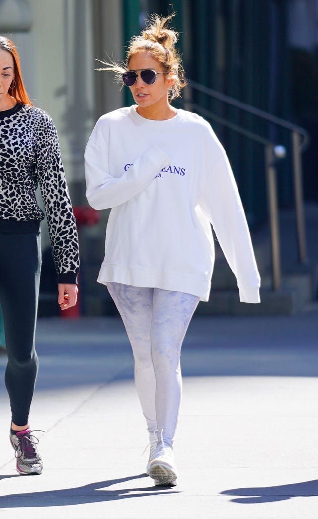 Working on her fitness! J.Lo kept covered up in a long-sleeved white tee and pale leggings en route to a New York City gym on March 20.