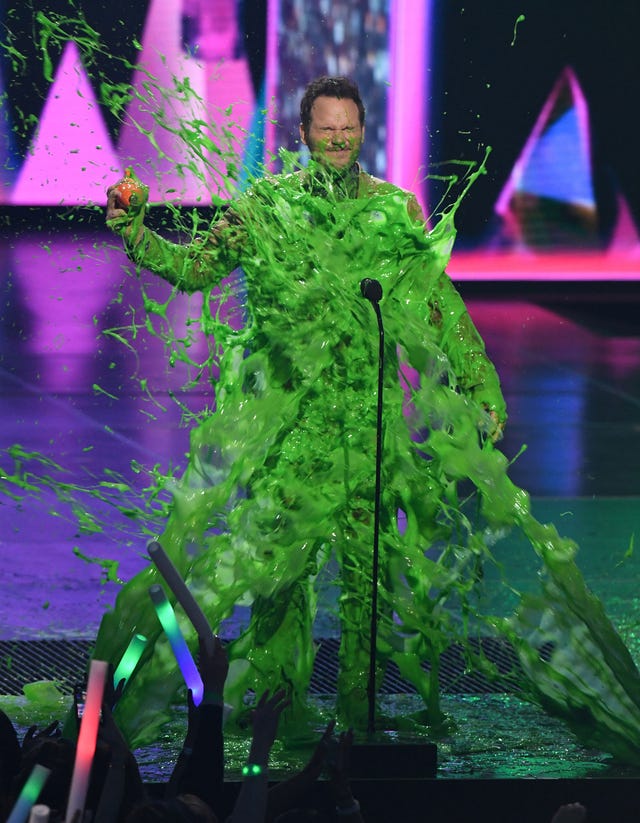 Slime time! The Jurassic World: Fallen Kingdom star got pummeled with green goo after winning an orange blimp for Favorite Butt-Kicker at the 2019 Nickelodeon Kids' Choice Awards in L.A. on March 23.