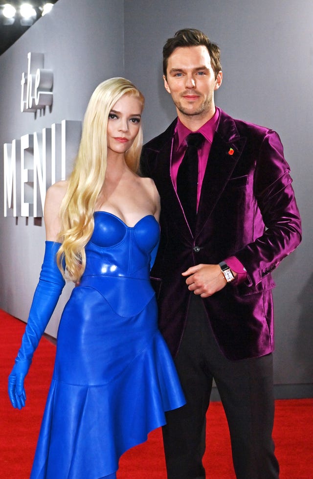 The two leading stars attend the U.K. premiere of The Menu at BFI Southbank wearing a bright blue dress and a maroon monochromatic suit on Nov. 9 in London, England.