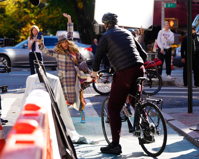 The actress films a dramatic scene for season 2 of HBO Max's And Just Like That... on Nov. 29 on the streets of New York City.
