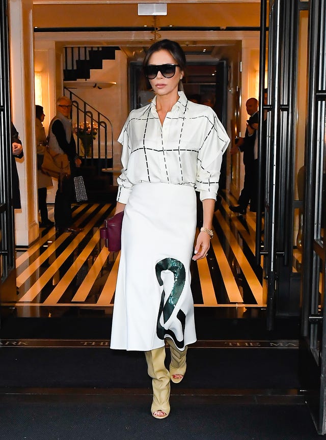 Clad in a white-and-black button-up-and-skirt combo and open-toed beige boots, the mom of four sashayed out of her New York City hotel on Oct. 18.