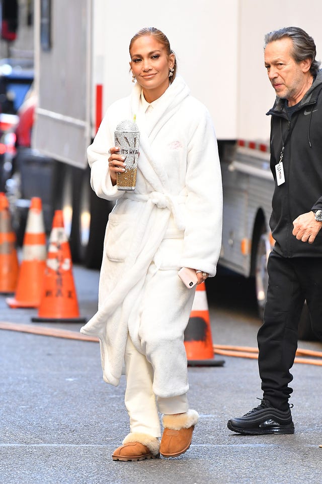 J.Lo looked coy in a white robe and UGG slippers as she held on tight to her bedazzled coffee cup on the New York City set of Marry Me on Oct. 15.
