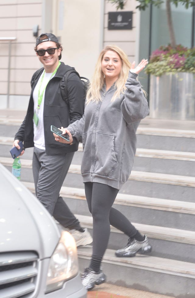 The Voice U.K. coach gave a big wave as she stepped out of a London hotel with her husband on Oct. 17.
