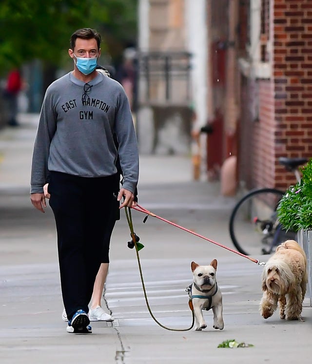 The actor sported a grey sweatshirt and black sweat pants while walking his and wife Deborra-Lee Furness' adorable dogs in New York City on Oct. 2.