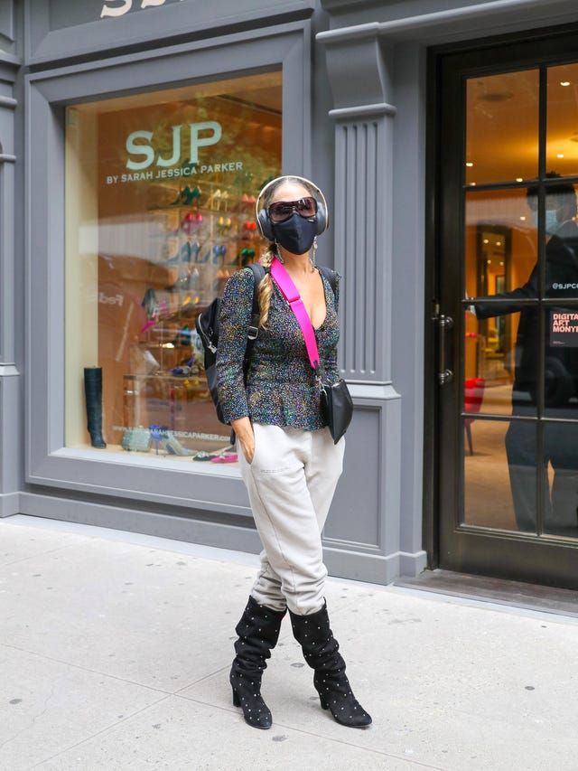 The Sex and City star posed in front of her New York City shoe store on Oct. 7, wearing a peplum top, slouchy pants and black studded boots perfect for the autumn season.