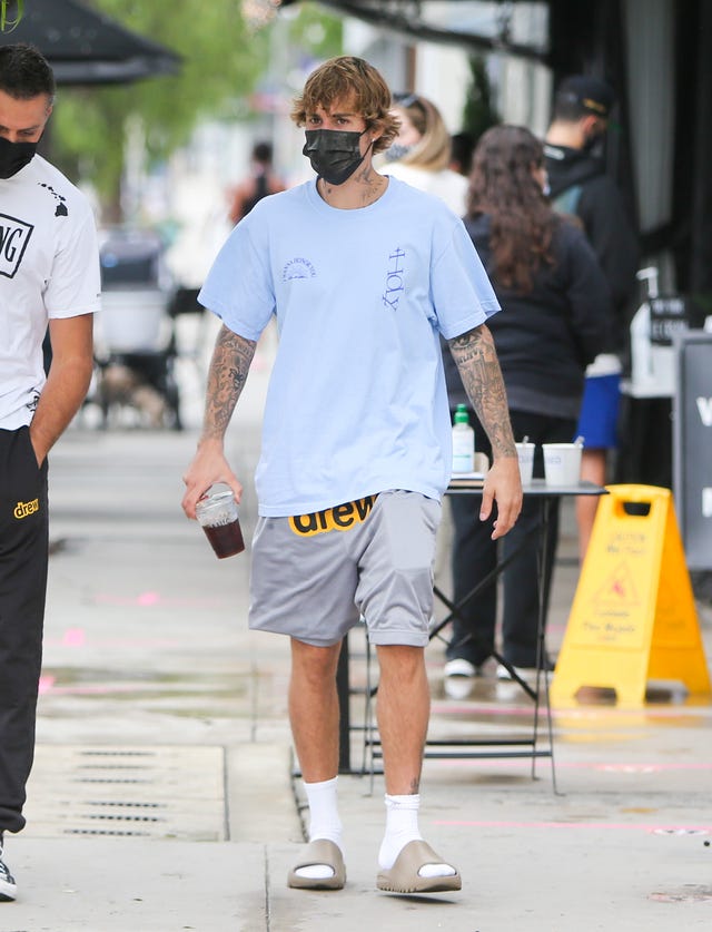 The "Intentions" singer was spotted in a baby blue Holy T-shirt with gray shorts while grabbing coffee in Los Angeles on Oct. 9.