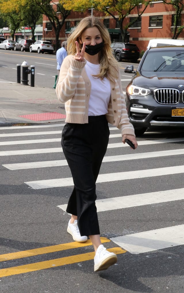The actress gave a peace sign to the paparazzi as she was spotted on the set of her latest film, The Flight Attendant, in New York City on Oct.10.