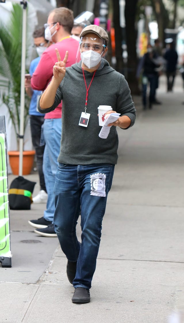 The actor gave the paparazzi a peace sign as he was also photographed on the set of his new film, Tick Tick Boom, in New York City on Oct. 24.