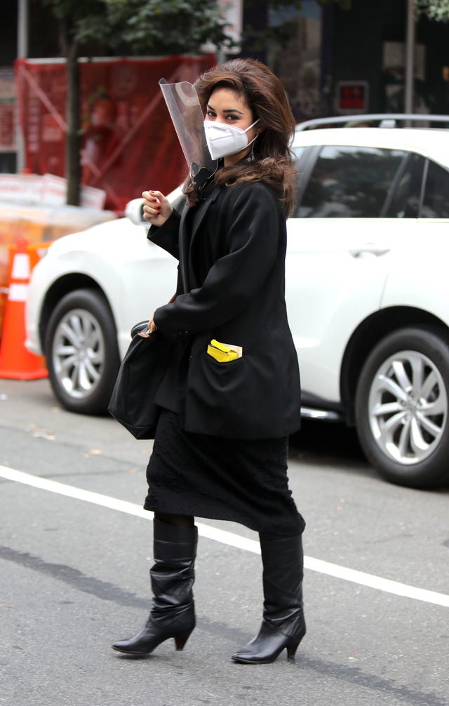 The 31-year-old actress wore an all-black ensemble, face mask and plastic face shield while on the set of her upcoming film, Tick Tick Boom, in NYC on Oct. 24.