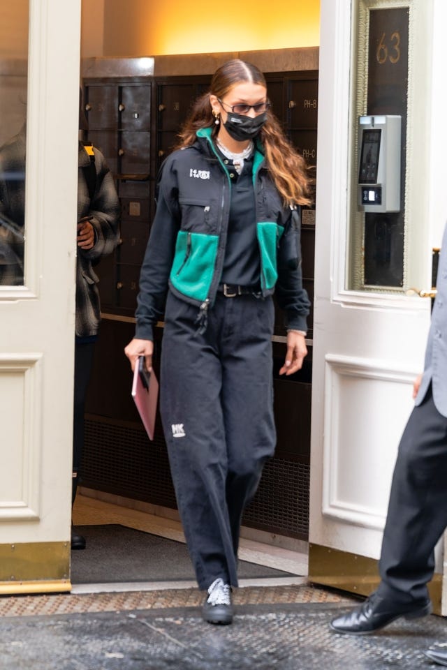 The model rocked a casual two-piece navy ensemble while spotted stepping out of a New York building on Oct. 30.