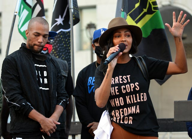 The actress, who was wearing a T-shirt asking for justice for the slain Breonna Taylor, joined the Insecure star at a Black Lives Matter protest in Los Angeles, California, on Oct. 28.