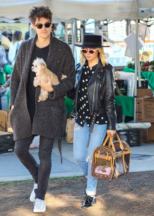 The High School Musical alum's hubby kept a good grip on their dog, Maui, as the trio strolled through a farmer's market in Los Angeles on Dec. 2.