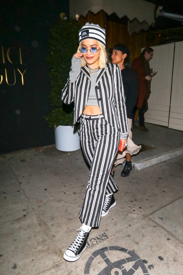 Stripes on stripes on stripes! The British singer wore head-to-toe black-and-white, save for a pair of blue oval sunglasses, while out in Los Angeles on Dec. 4.