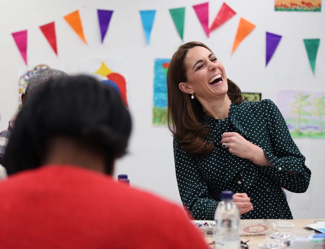 The Duchess of Cambridge let out a huge laugh while doing arts and crafts during a visit to Evelina London Children's Hospital with husband Prince William (not pictured) on Dec. 11.